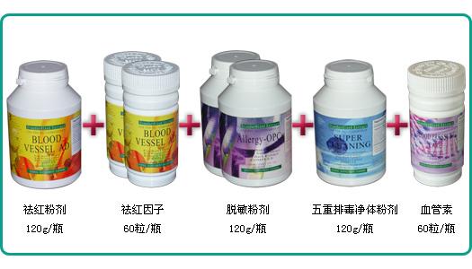 美国嘉康红血丝治疗套装的治疗方案:1、内疗血管的“祛红因子”:红血丝医学上也叫毛细血管扩张,内疗血管的“祛红因子”---著名的毛细血管修复剂,能高效清除自由基,给予血管壁合成所需的充足营养,修复受损的血管壁,使血管恢复正常的弹性与韧性,治疗毛细血管持续扩张所产生的点状、线状、片状伤害,对于光子嫩肤、果酸换肤、护肤品使用不当所造成的面部红血丝、面部红斑,先天性面部潮红,遇冷遇热、情绪激动产生的发红发烫均有极好的效果;同时对于毛细血管扩张引起的灼热感、刺痛感也有极好效果。2、外治敏感的“脱敏因子”:标准化抗过敏制剂,专门针对肌肤遇冷遇热敏感引起毛细血管扩张情况,提高皮肤抵抗外界各类刺激的能力,深入细胞从根本上阻断皮肤敏感的诱发因子,彻底改变皮肤敏感,提高皮肤免疫力,彻底消除红血丝人士肌肤易敏感现象。3、快速排毒的“五重排毒净体因子”:根据2003年诺贝尔奖获得者所发现的细胞膜水通道和离子通道,纯天然排毒因子活性物质能够增强细胞能量,迅速清除血液内多余脂肪、毒素等血液垃圾,恢复血流畅通,避免血管淤阻而导致的红血丝;同时快速提高人体的自然排毒能力,使祛红血丝套装中的各种营养成分能最大成度的吸收和利用,在彻底解决了面部红血丝的问题的同时,令肌肤白皙、通透,焕发健康光彩。4、全面恢复血管健康的“血管素”:专门针对受损的血管系统进行修复,清除血管壁上黏着的脂肪及噬菌斑等血管垃圾,修复受损血管壁,恢复血流畅通,强化血管弹性,防止血管通透性改变而造成的血红细胞等外渗现象。对血管的扩张、血管壁薄、弹性减弱、脆性增加的修复与改善有极好的效果。全球几百万客户的服用验证,欧美万名家庭医生和美容专家推荐使用,50年临床试验经验,50年无一例副作用的临床试验报告。(详见:国际最权威的毒理學期刊Toxicology 2000, Aug7:48(2-3):187-197)红血丝皮肤日常保养注意事项:1、不要让皮肤长时间暴露在极冷或极热的环境中。2、选择性质温和的护肤品,不要使用含有激素、腐蚀成分或酸性过高的护肤品,疗效性护肤品请慎用,尤其是美白、祛斑、抗过敏产品。3、在美容院时也最好不要用蒸汽蒸脸,甚至是洗澡时,也尽量不要用冷、热水直接喷淋面部。4、脸部有红血丝的皮肤的表皮层已经非常薄,去角质产品只会让问题更严重;此外,您在涂抹护肤品或是洗脸的动作都要尽可能的轻柔,否则只会让脆弱的毛细血管更易扩张,红血丝更严重。5、避免任何会使毛细血管扩张的东西---比如热,辣,酒精,咖啡和可乐。6、不要长期使用抗敏药膏。通常有红血丝的皮肤都比较敏感,出现过敏都喜欢涂抗敏药膏。抗敏药膏大多含有皮质激素,长期使用会刺激皮肤,使皮肤更加敏感,加重红血丝,还可能导致出现满月脸、水牛背、痤疮、多毛等等。7、若您面部已有红血丝,干燥则会让您的皮肤愈演愈烈,皮肤及时补水是必要的。8、美国嘉康祛红血丝套装治疗结果是:改善皮肤敏感状况、排除毒素 --- 修复受损的毛细血管、增强毛细血管弹性、打通血管淤阻、消除血管炎症----补充肌肤营养及水分、修复受损的角质层,增强皮肤抵抗力-----祛除红血丝一次同步完成。